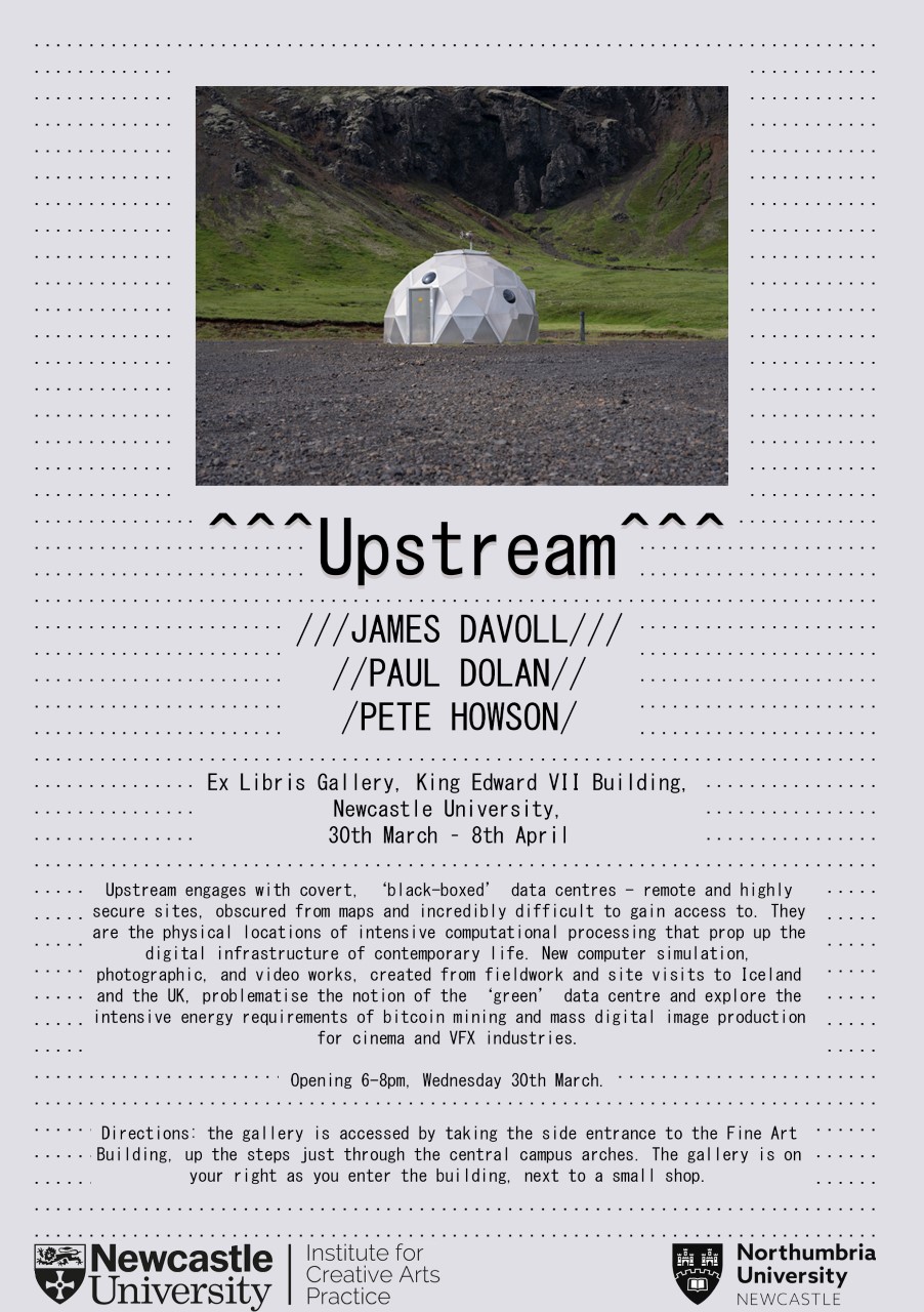 Upstream engages with covert, ‘black-boxed’ data centres - remote and highly secure sites, obscured from maps and incredibly difficult to gain access to. They are the physical locations of intensive computational processing that prop up the digital infrastructure of contemporary life. New computer simulation, photographic, and video works, created from fieldwork and site visits to Iceland and the UK, problematise the notion of the ‘green’ data centre and explore the intensive energy requirements of bitcoin mining and mass digital image production for cinema and VFX industries.